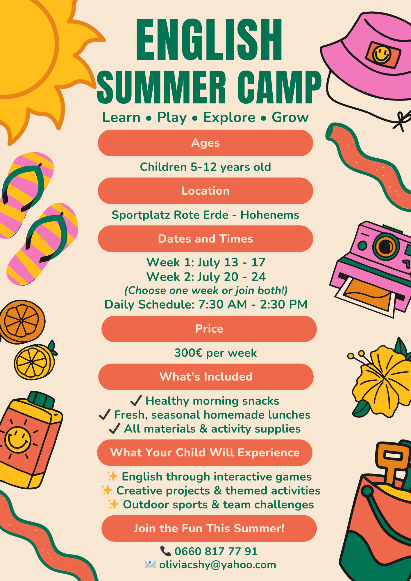 Mein Englisch-Sommercamp bietet Kindern eine spielerische und entspannte Möglichkeit, ihre Englischkenntnisse zu verbessern. Das Camp ist für Volksschulkinder gedacht und findet in kleinen Gruppen statt, damit eine persönliche und unterstützende Atmosphäre entsteht.