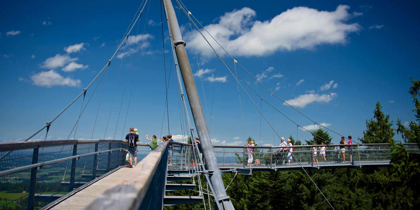 In luftiger Höhe! Der skywalk Naturerlebnispark bietet allen Altersgruppen Spaß und Action. Auf Familien warten Abenteuerspielplatz, Erlebnisstationen im Wald, Geschicklichkeitsparcours, Barfuß- und Baumwipfelpfad mit Wackelbrücken und Röhrenrutsche in knapp 1.000 m Höhe.
